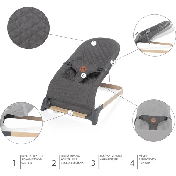 Le transat Miura permet à l’enfant d’être au centre de l’action, tandis que les parents peuvent s’occuper de leurs obligations ou s’amuser. Les sangles douces assurent la sécurité maximale de l’enfant dans le transat, qu’il se repose ou joue. Le tissu solide avec un motif en diamant offre du confort tout en fournissant un soutien adéquat.