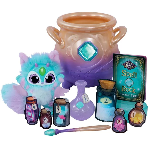 Le chaudron magique Magic Mixies contient une baguette magique spéciale et tous les ingrédients dont tu as besoin pour préparer une potion et donner vie à une créature toute douce trop mignonne ! Commence par ouvrir ton grimoire pour découvrir la formule magique, puis ajoute la gemme de cristal, la plume magique et les autres ingrédients un par un dans ton chaudron (chaque ingrédient est nécessaire pour donner vie à ta créature). Lorsque la lumière devient verte, tapote le chaudron 3 fois avec ta baguette magique pour découvrir des effets lumineux et sonores. Une fois la potion terminée, de la VRAIE brume sort du chaudron. Tends alors l’oreille pour entendre ton Magic Mixie prendre vie comme par magie ! Te voilà maintenant en compagnie d’un nouvel ami magique ! Il n’y a pas plus adorable que ton Magic Mixie. Interactif, il réagit à ton toucher et à celui de ta baguette. Il adore jeter des sorts avec toi et pourrait même exaucer l’un de tes souhaits lorsque sa gemme s’illumine ! Plus tu prends soin de ton Magic Mixie, plus il a de l’énergie.