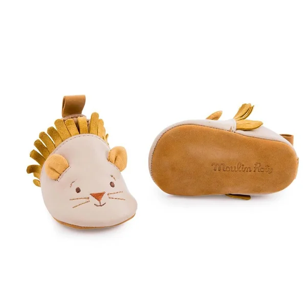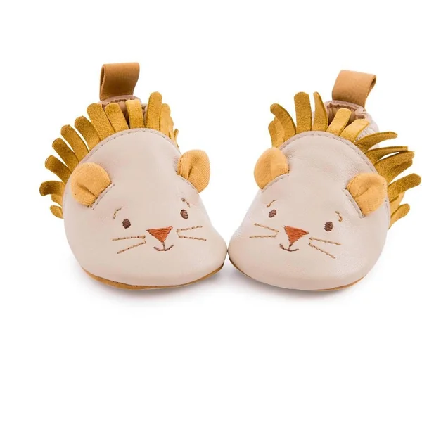 Chaussons en cuir 18/24m avec fermeture élastiquée, brodés d’une tête de lion avec sa crinière jaune soleil. Ils sont doublés, souples, avec une semelle en cuir velours antidérapante et une semelle intérieure amovible avec mousse, pour le confort de bébé