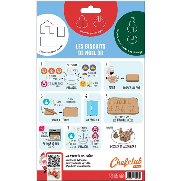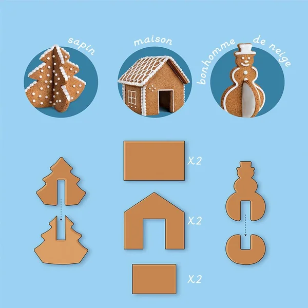 Les biscuits de Noël 3D est un kit d’emporte-pièces en métal pour cuisiner et assembler comme un puzzle trois décors de Noël : le sapin, le bonhomme de neige et la maison du Père Noël. Une recette illustrée en pas-à-pas pour réaliser les biscuits en 3D est incluse dans le packaging. 7 emporte-pièces en métal pour assembler 3 décors d’hiver : le sapin, le bonhomme de neige et la maison du Père Noël. Les emporte-pièces passent au congélateur et au lavevaisselle. Recette de biscuits illustrée en pas-à-pas et en vidéo incluse. Une fois assemblés, le sapin atteint 8,2 cm de hauteur, la maison 10 cm et le bonhomme de neige 8,7 cm.