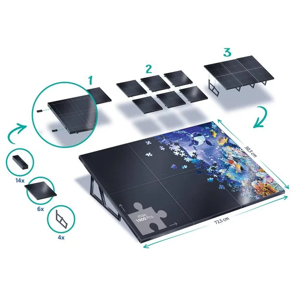 Assemblez vos puzzles avec un maximum de confort grâce à ce pupitre incliné antidérapant et ultra léger. Son inclinaison vous permet d’être totalement à l’aise pour monter votre puzzle et soulage votre nuque. La surface antidéparante permet aux pièces de ne pas glisser et de rester à l’endroit où vous les placez. Fabriqué à partir de 98% de matériaux recyclés, ce chevalet très léger se transporte facilement, pour vous permettre de débarrasser rapidement et sans effort votre table de travail. Il peut accueillir des puzzles jusqu’au format 1000 pièces (maximum 70 x 50 cm).