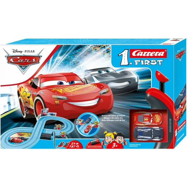La piste de course Carrera FIRST de 2,4 m avec les voitures Flash McQueen et Jackson Storm du film CARS, pour les enfants à partir de 3 ans, fonctionne sur batteries, comprend des lignes droites, des virages, une porte tournante, des manettes et des décorations sur le thème de CARS.