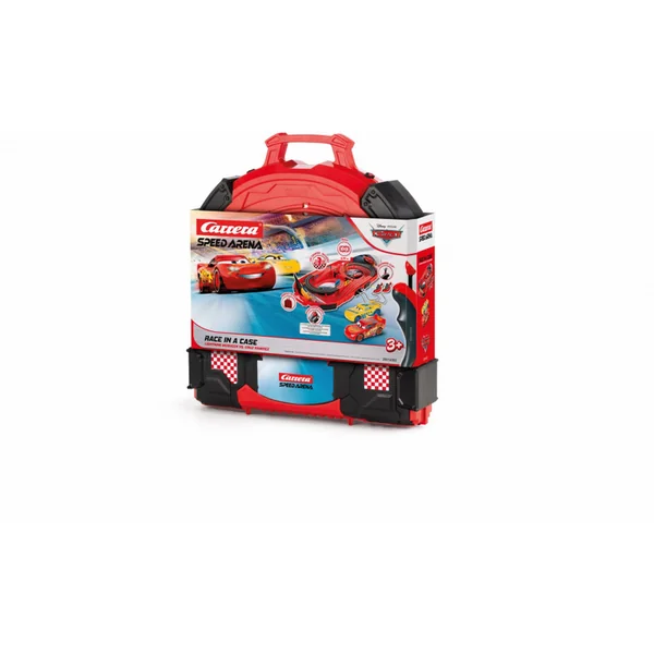Piste Carrera Speed Arena de 2,77 m avec les voitures Flash McQueen et Dinoco Cruz, pour les enfants à partir de 3 ans, fonctionnant sur batteries (4xAA ou recharge via USB-C). La piste est emballée dans une mallette portable et comprend des lignes droites, des virages, des pilotes, un compteur de tours intégré et des décorations sur le thème des voitures Disney.