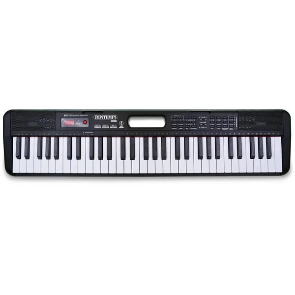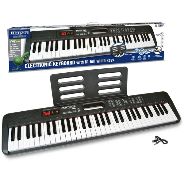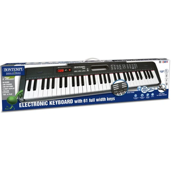 Clavier digital 61 touches avec touches taille piano + port USB. Polyphonie 8 notes, 60 mélodies préenregistrées, 200 sons, 200 rythmes, fonction Record and Play, métronome. Fonction transposer. Ecran digital. Gestion facilitée des accords, fonction d’apprentissage, sons de 12 percussions sur le clavier. Réglage du volume et du tempo. Port pour adaptateur secteur, micro à condensateur, casque (ces équipements ne sont pas fournis). Amplification stéréo. Fonctionne grâce à un adaptateur USB-DC (inclus), secteur (non fourni) ou à 4 piles AA (non fournies). Porte partition inclus.