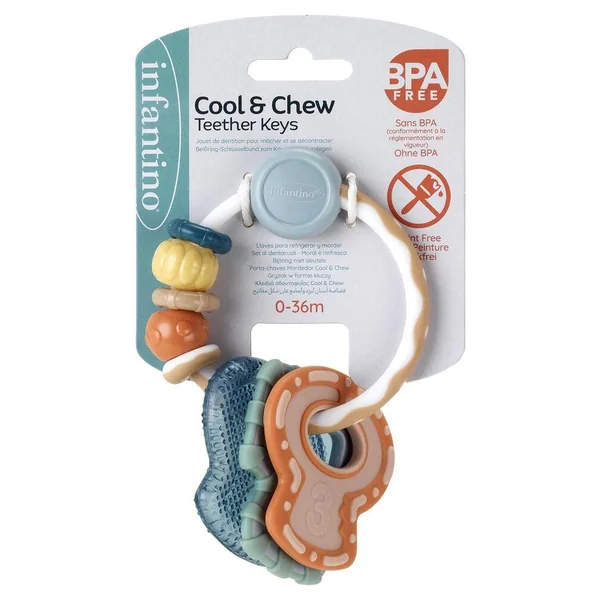 Les clés de dentition Infantino Cool ET Chew offrent trois textures uniques pour stimuler les sens et soulager les gencives de bébé.L’anneau facile à saisir est agrémenté de perles colorées qui tournent et font du bruit, apportant une stimulation supplémentaire.Chaque clé de dentition propose une texture différente, incluant une clé douce remplie d’eau pour un confort supplémentaire.Il suffit de réfrigérer les clés pour un soulagement apaisant supplémentaire.Idéal pour les bébés de la naissance à 36 mois.