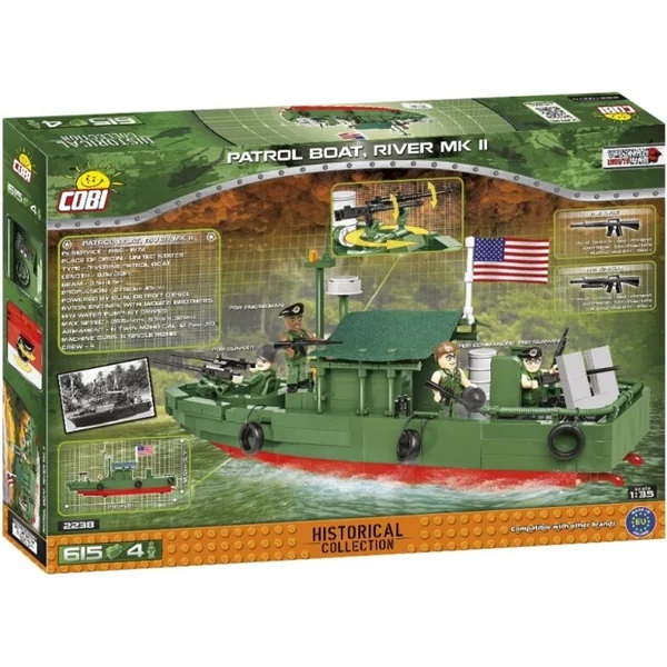 Construisez un modèle de bateau de patrouille, également connu sous le nom de bateau de garde, rivière ou PBR, qui est très caractéristique du conflit vietnamien, un bateau américain servant à patrouiller les rivières et à transporter des troupes. Sa caractéristique principale était son très faible tirant d’eau, dont il devait en partie sa coque en fibre de verre et son propulsion par jet d’eau, ce qui lui permettait de naviguer dans les eaux peu profondes. Le bateau atteignait une vitesse maximale de 28,5 nœuds (53 km/h 32 mph). L’équipage était composé de quatre soldats. Un sous-officier de première classe servait généralement comme capitaine du bateau avec un tireur, un mécanicien et un marin à bord. Le bateau compensait le manque de blindage par une puissance de feu relativement importante. L’équipement était généralement armé de deux M2HB 0,50-12,7 mm à l’avant et d’un M2HB à l’arrière. De plus, l’équipage avait à sa disposition un lance-grenades et un ensemble de fusils M16. Il existait également des configurations plus puissantes. Les bateaux étaient utilisés par la marine américaine jusqu’aux années 90. Ils restent populaires parmi les civils. L’emballage contient 615 blocs et 4 figurines.