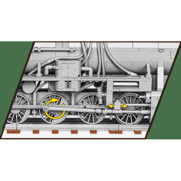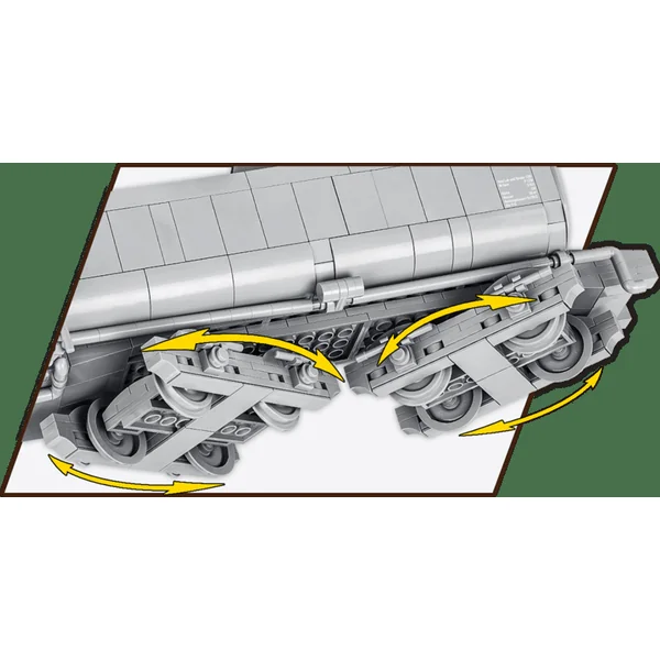 Il comprend également cinq segments de rails réalistes avec des traverses en bois d’une longueur totale de 65 cm. Les segments de rails ont des trous pour un éventuel ancrage au sol du diorama ferroviaire. Il y a aussi une figurine de conducteur de locomotive allemand. Le modèle est entièrement compatible avec le système de rails d’autres kits et gère les courbures R88. Le modèle est équipé de crochets de remorquage, permettant de connecter d’autres wagons à la locomotive.