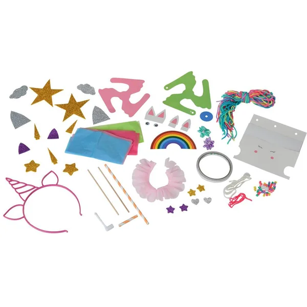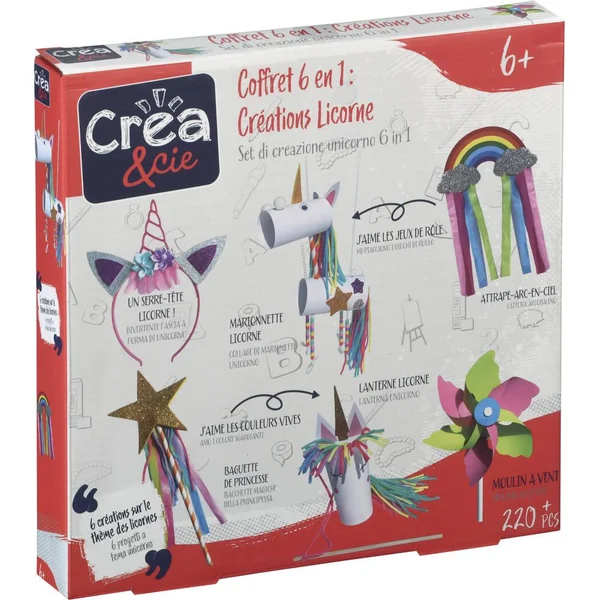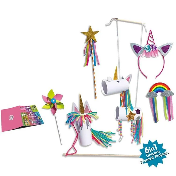 Plus de 220 pièces au total. Permet de réaliser 6 créations sur le thème des licornes : dont 1 serre-tête licorne, 1 marionnette licorne collage, 1 attrape-arc-en-ciel, 1 baguette de princesse, 1 licorne suspendue à un bâton (style lanterne), et 1 moulin à vent. Nombreux accessoires : papier d’impression, papier pailleté, papier coloré, fils de couleur, baguettes, paille en papier, yeux autocollants, boules en peluche, perles colorées, serre-tête, support de moulin à vent et ruban adhésif. Instructions incluses. Développe la créativité.