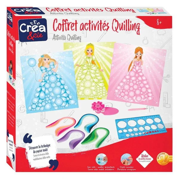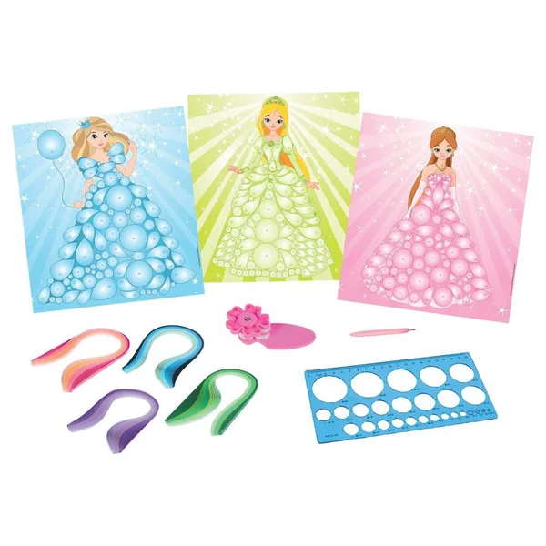 Réalise de superbes princesses. Découvre la technique artistique du papier roulé ou quilling Art. Coffret complet pour réaliser simplement des décors et créations à partir de bandelettes de papiers enroulées et personnalisées, grâce aux accessoires inclus. Créations 3D en papier ! Sans colle : modèles autocollants. Inclus : 3 modèles de princesse (3 feuilles), 4 paquets de papier, 1 stylet enrouleur, 1 machine à cranter le papier, 1 règle graduée de 20 en plastique avec des gabarits, et une notice. Dimensions d’un modèle princesse : 25 x 27,5 cm.