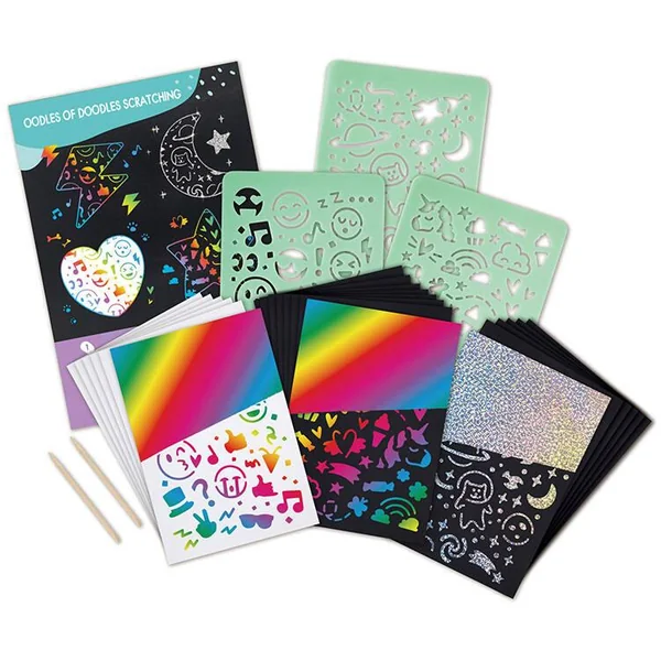 – Comprend trois feuilles A5 de pochoirs thématiques amusants, 20 feuilles à gratter avec trois types de couches de couleur, deux stylets en bois et un poster A4.