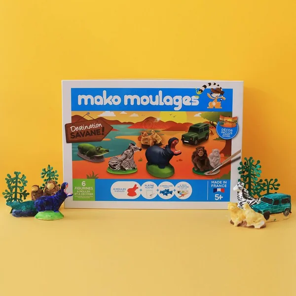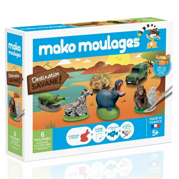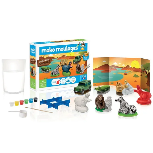 Kit créatif de 6 moules en latex (crocodile, hippopotame, zèbres, singes, 4×4, lionne et ses lionceaux), 1 sachet zippé refermable de 800g de plâtre, 6 pots de peinture 5 ml (noir, vert, blanc, bleu, jaune, rouge). 8 croisillons, 1 pinceau, 1 notice de jeu et 1 décor de jeu, Mako moulages, de la joie au bout des doigts ! Fabriqué en France.