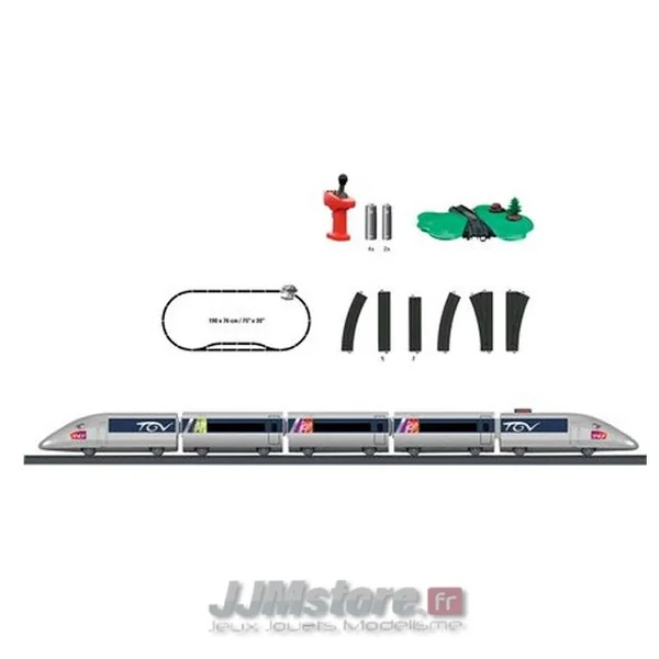Coffret de départ TGV Duplex MARKLIN : H0 – Référence 29306 Train électrique à l’échelle H0 à grande vitesse inspiré du TGV Duplex Marklin, rame à cinq éléments conçu spécialement pour les enfants souhaitant débuter avec un train électrique de qualité. Le train dispose de 3 crans de marche en marche avant et marche arrière, de 3 fonctions sonores et d’un fanal à trois feux. Contenu de ce coffret Marklin : 11 éléments de voie courbes en plastique (R1), Un Power Control Stick Märklin ergonomique sans fil ainsi qu’un dispositif d’aide à l’enraillement, 4 piles AA et 2 piles AAA sont fournis. Le train peut être exploité sous deux fréquences différentes et donc être complété par un autre train à piles. Extension possible avec le coffret de complément pour voie plastique réf. 23300. Le train peut être exploité sous deux fréquences différentes (C/D) et donc complété par un autre train à piles. Notice et instruction de montage du |