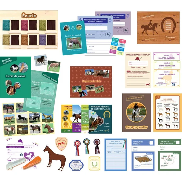 Un jeu pour imaginer le centre équestre de ses rêves. 60 accessoires pour jouer avec sa passion des chevaux : livret du cavalier, passages de galops, licences et registre du club, stickers de chevaux, flots à remettre pour les concours de sauts et d’obstacles…