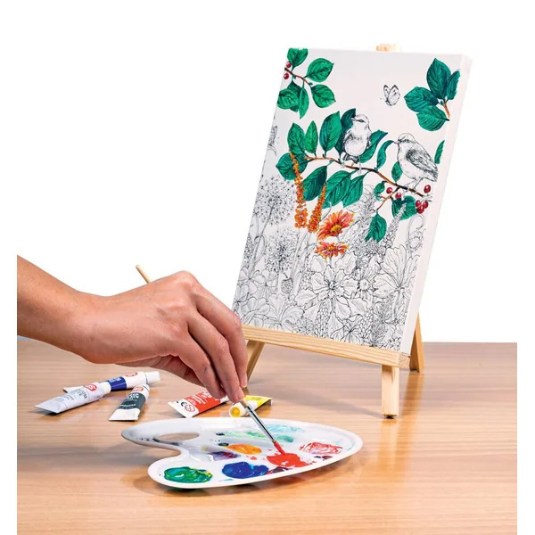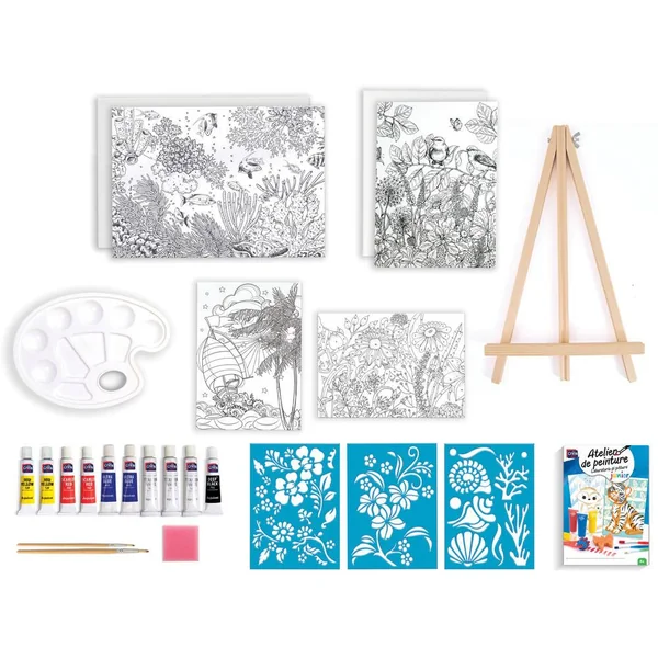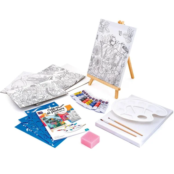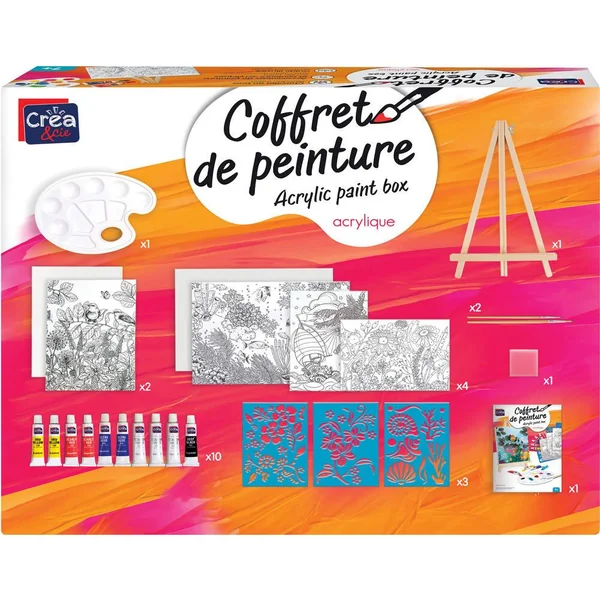 Contient 1 chevalet en bois 36 x 20 cm, 1 palette, 10 tubes de peinture, 1 toile blanche et 1 pré-imprimée, 4 cartes (3 pré-imprimées et 1 blanche), 2 pinceaux différents, 1 éponge, 3 feuilles de pochoir, 1 guide détaillé illustré.