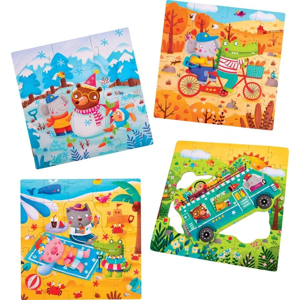 Coffret de 4 puzzles pour 4 saisons : difficulté progressive puisque l’enfant commence avec 12 pièces, puis 16 pièces et 24 pièces pour finir à 32 pièces. Chacun va a son rythme, convient pour plusieurs enfants. Total de 84 pièces : les 4 puzzles peuvent constituer une grande frise en les mettant côte à côte dans le bon ordre.