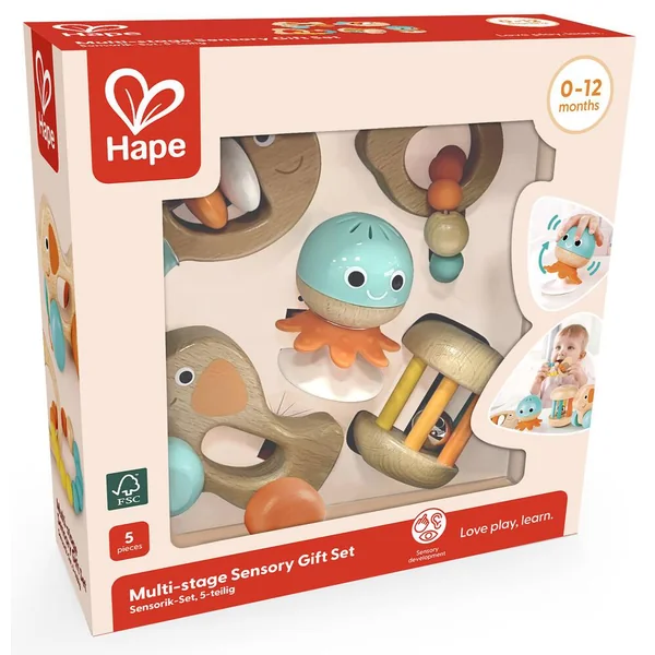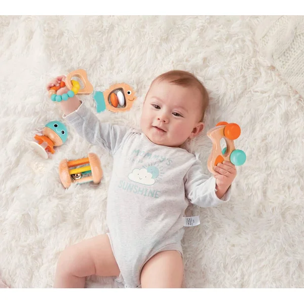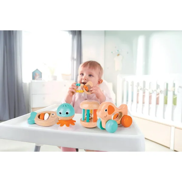 Ensemble sensoriel de 5 pièces pour aider votre bébé à grandir. Comprend un hochet poisson, un anneau de dentition en forme de perles, un hochet ventouse, un hochet à roulettes et un chien sur roues.