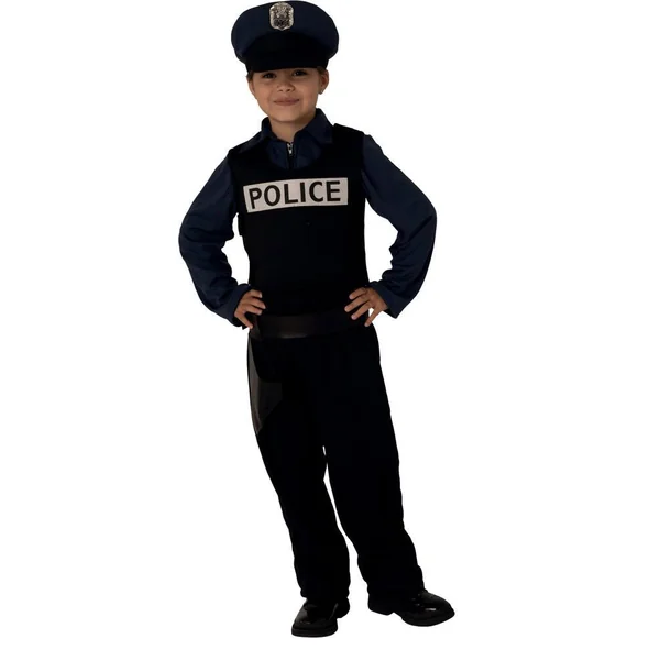 Collection métier. Déguisement de policier. Contient : 1 casquette de police, 1 chemise bleue avec fermeture éclair, 1 pantalon noir, 1 gilet de protection doublé de mousse avec poche frontale et fermeture par velcro, 1 holster et 1 paire de menottes. Le modèle est destiné aux enfants de 3-4 ans. Stature : 102 cm. Tour de poitrine : 56 cm. Tour de taille : 52 cm. Matière des vêtements : 100 % polyester, lavable en machine à 30° en cycle délicat. Chaussures non fournies.