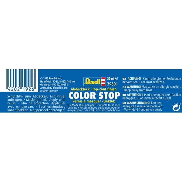 Revell Color Stop est une substance semblable à du caoutchouc appliquée au pinceau sur les surfaces ou les lignes que vous souhaitez masquer. La substance appliquée sur la surface couverte au pinceau ou en spray peut être facilement décollée une fois sèche.