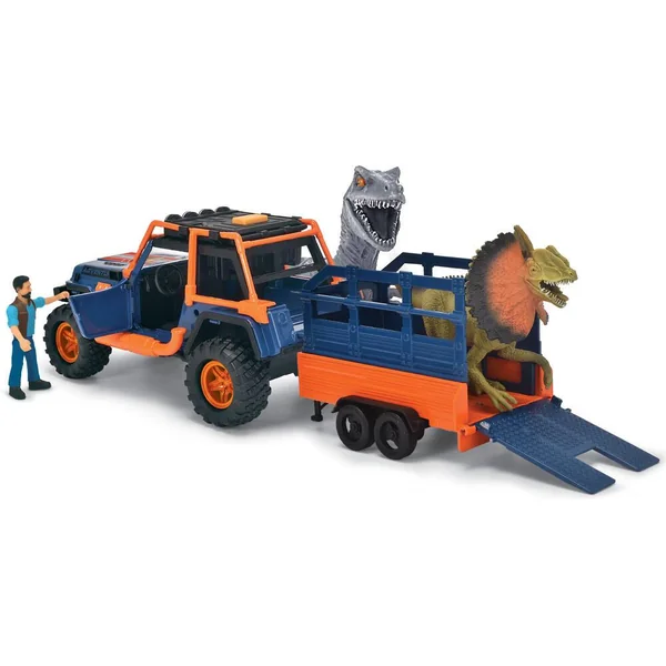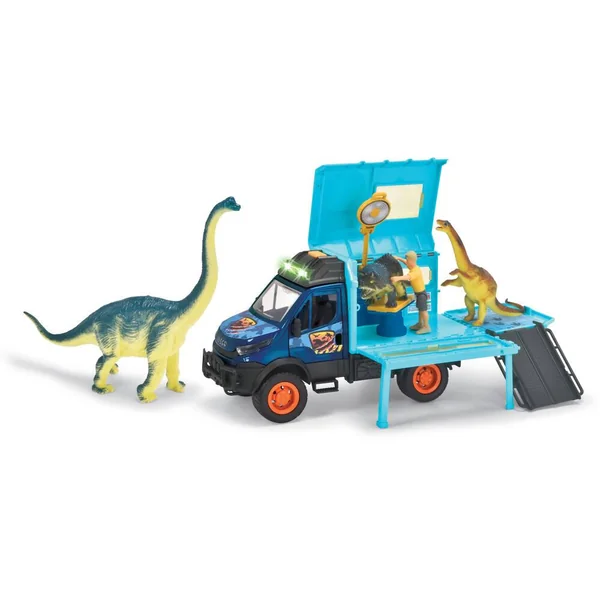 Coffret commando de dinosaures. 3 modèles assortis : style A Jeep de 40 cm avec cage et 2 dinosaures ; style B 4×4 Iveco échelle 1:24 de 26 cm avec laboratoire Dino dépliable et 3 dinosaures ; style C Ford Raptor de 28 cm avec cage, rampe pliable et 3 dinosaures. Chaque coffret contient : 1 véhicule et des figurines articulées. Avec son et lumière. Les portes s’ouvrent. 3 piles boutons (LR44) fournies pour les modèles A et C et pour le modèle B 1 pile LR03 fournie. Fonction Try Me. En plastique. Dimensions : style A avec remorque 40 x 12 x 12 cm, style B 26 x 11.5 x 14 cm, style C 28 x 12.5 x 14 cm. Instructions sur la boite.