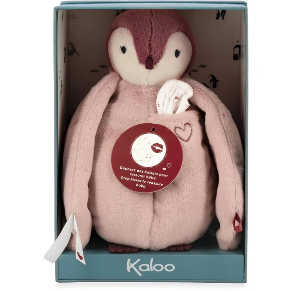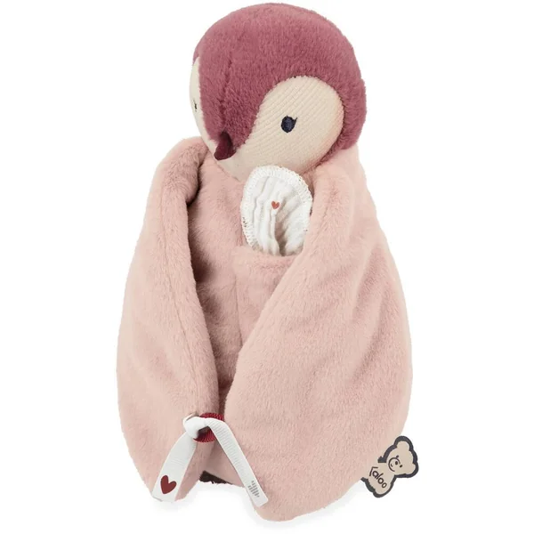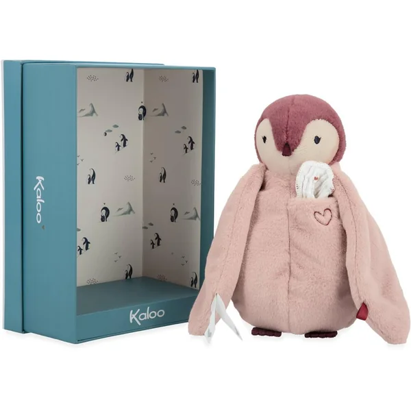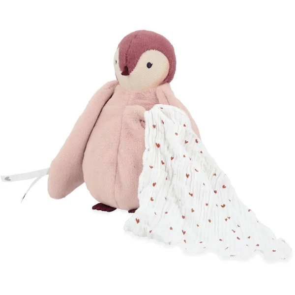 Ce tendre manchot rose tout doux de 20 cm de hauteur, est toujours prêt à réconforter bébé lors des moments de séparation. En fourrure extra douce avec une poche sur son cœur qui contient un long mouchoir en mousseline de coton pour s’imprégner des odeurs des parents où pour y déposer des baisers. Ils pourront ainsi mettre près d’eux la peluche afin que celle-ci maintienne leur odeur et puisse envelopper bébé dans une vague de réconfort quand il la prendra. Les ailes du manchot se nouent entre elles par des rubans ornés d’un joli cœur, symbolisant ainsi la protection et le lien d’attachement. Il est présenté dans une jolie boîte cadeau personnalisable et qui peut être réutilisée comme étui de rangement.Lavable en machine à 30°. Rembourrage en polyester recyclé. Dès la naissance.