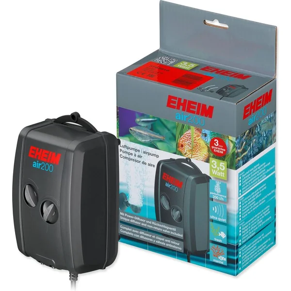 Avantages de la pompe à air EHEIM : -Fonctionnement très silencieux, longue durée de vie, meilleure qualité -Le débit d’air est réglable à chaque sortie d’air de l’appareil -réglage supplémentaire du débit d’air et de l’effet de bulles à l’aide d’un diffuseur -Contenu : diffuseur : AP200, tuyaux aériens de 2 m -Tampons en caoutchouc pour l’amortissement des vibrations -Crochet pour suspension verticale Données techniques : -Puissance : 3,5 W -Largeur : 8,9 cm -Hauteur : 15,2 cm -Profondeur : 7,1 cm -Diamètre du tuyau à air : 4 mm Type d’appareil : Compresseur