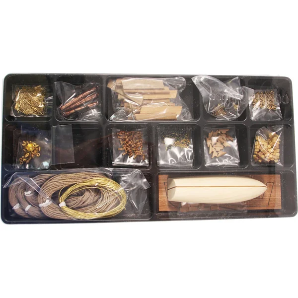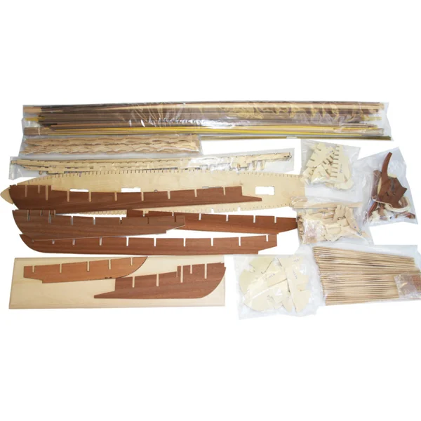 L’emballage contient un ensemble de pièces en contreplaqué, un ensemble de baguettes en bois de différentes sections, un blister avec de petites pièces, des pièces en laiton, un ensemble de dessins et un manuel multilingue.