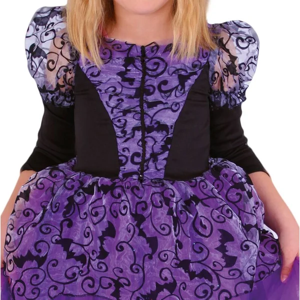 - Une robe violette avec une jupe bouffante et des manches trois-quarts ornée d’un motif de chauve-souris noir.
