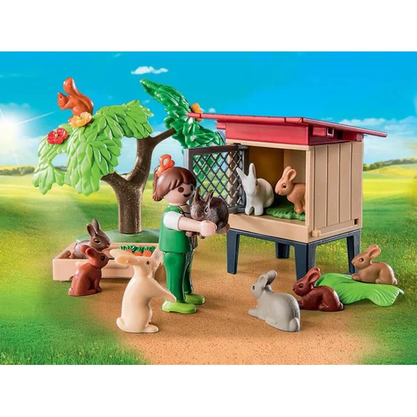 La petite fille Playmobil prend soin de ses lapins bien à l’abri dans leurs deux clapiers. Tous les jours, elle joue avec eux et les gâte avec des friandises. Contient un personnage (enfant), 2 chiens et 2 chiots et des accessoires (cabane pour les chiens et arbre, gamelle et frisbee). 41 pièces.