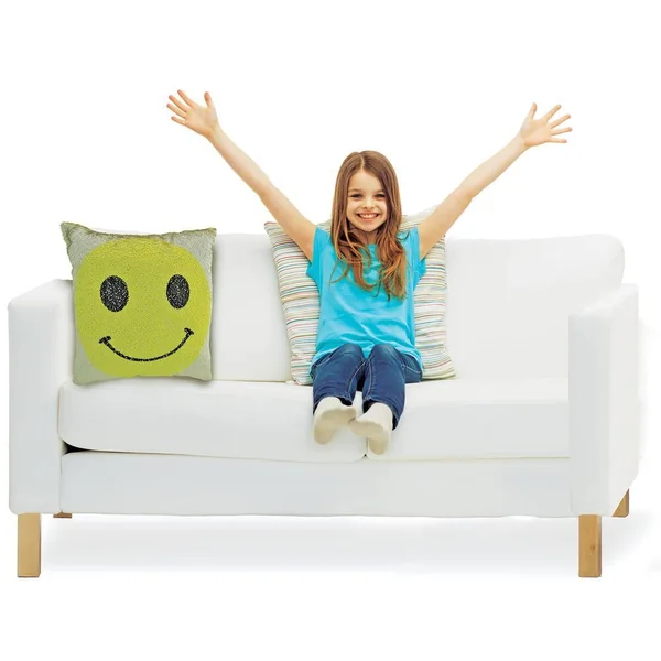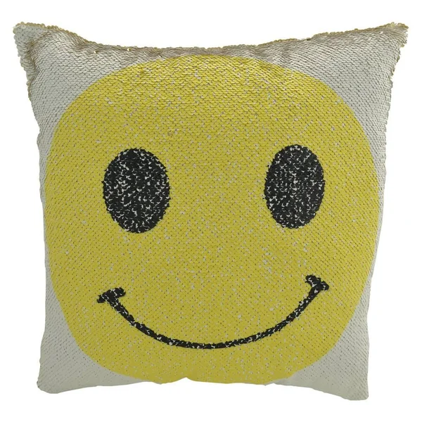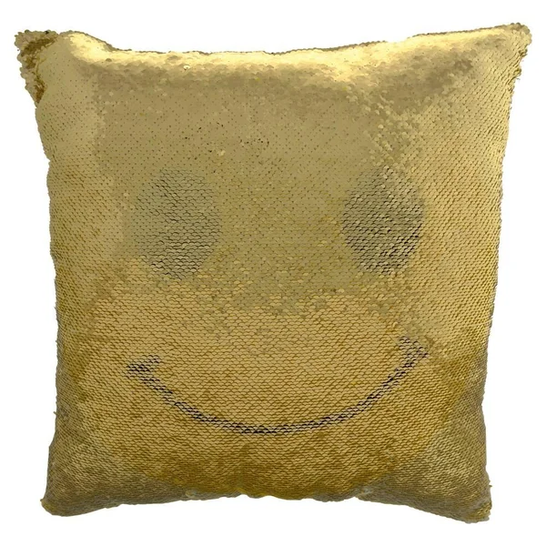 Coussin carré de 40 cm avec des sequins dessinant un sourire sur la face avant. Réversible : quand on passe la main sur les sequins on fait apparaître le sourire ou une face complètement dorée.