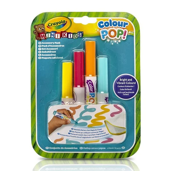 Feutres pour débuter les premiers coloriages de l’enfant dès 36 mois. Grâce au chiffon, il peut colorier et effacer ses dessins facilement pour une plus grand liberté créative. Contient : 4 feutres Color Pop + 1 chiffon