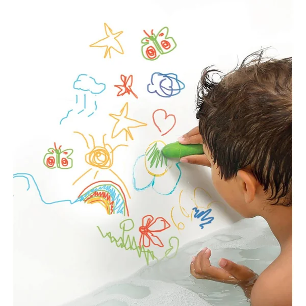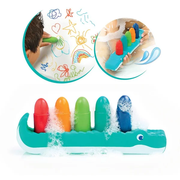 Pour laisser l’imagination des enfants s’exprimer ! Retrouvez 5 crayons lavables (bleu foncé, turquoise, jaune, rouge et vert) pour transformer le bain en une œuvre d’art et sans faire de dégâts ! Les enfants peuvent poser de la couleur sur la baignoire ou les carreaux de la salle de bain (toutes surfaces glissantes) ! Vous pourrez écrire des chiffres et des lettres, améliorer l’orthographe de votre tout-petit ou tout simplement le laisser gribouiller, dessiner ce qu’il veut. Pratiques, en quelques coup d’éponge, la couleur s’en va sans laisser de traces pour tout remettre en ordre. L’étui permet aux enfants de ranger facilement leurs crayons. De bonne taille, les 5 crayons sont très faciles à prendre en main et aident au développement de la dextérité des enfants. Solides et résistants à l’eau, les enfants pourront les laisser tomber dans le bain sans craindre qu’ils ne fondent. Un support original en forme de crocodile permettra à votre enfant de ranger ses crayons une fois le bain terminé. Sa matière en mousse douce et légère fait du crocodile un bon jouet flotteur.