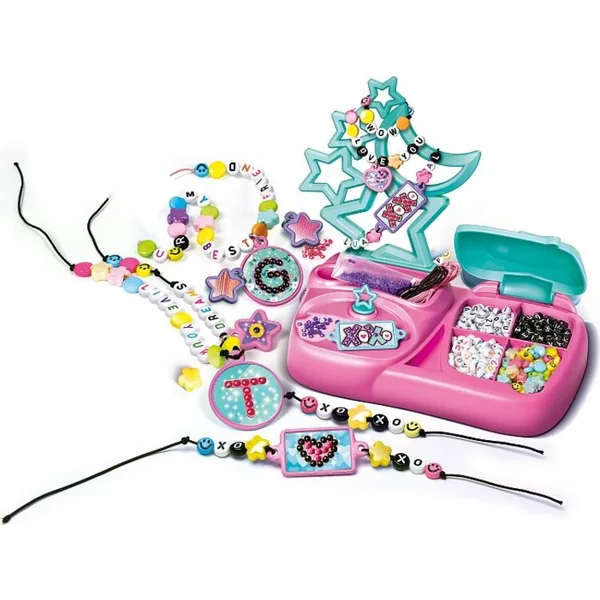Kit pour créer des bijoux et accessoires tendance avec des lettres, des perles colorées, des pierres scintillantes et des cordons élastiques. La base se compose de trois parties : un espace pour décorer des pendentifs et des assiettes avec des pierres colorées, un compartiment pour trier les perles et un support à bijoux pour ranger les créations.
