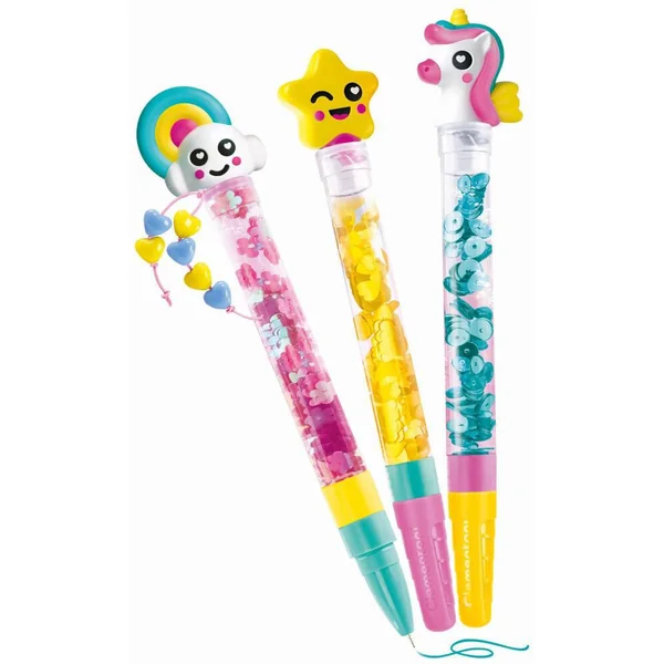 Les stylos peuvent ensuite être personnalisés en ajoutant des décorations sur le haut du stylo et dans le corps.
