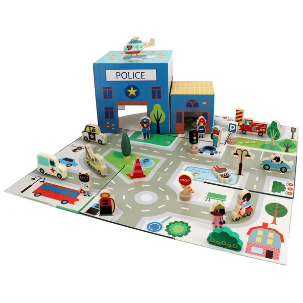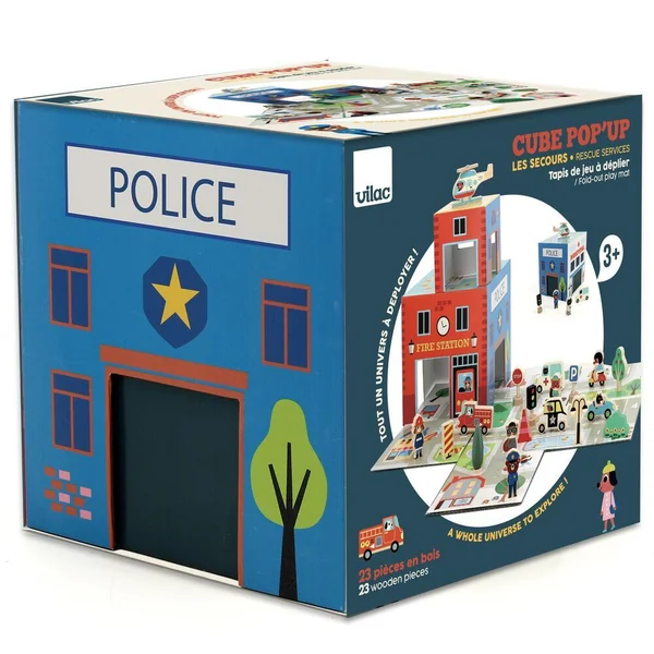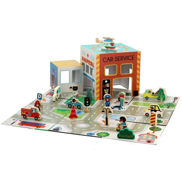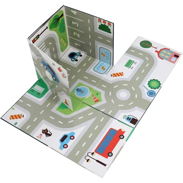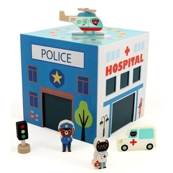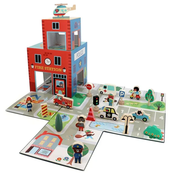 Ouvrez le couvercle et plongez dans l’effervescence de la ville ! Ce magnifique coffret illustré par Ingela P. Arrhenius se déploie pour révéler un grand décor urbain plein de vie : routes, carrefours, immeubles colorés et petits détails rétro composent un vaste tapis de jeu où tout peut arriver. Le couvercle se transforme en caserne des pompiers, en hôpital, en hôtel de police ou encore en garage avec ses portes et fenêtres découpées, tandis qu’un second bâtiment en carton complète la scène, prêt à accueillir les véhicules d’intervention. Pompiers, policiers, ambulances et dépanneuses se mettent en action pour venir en aide aux habitants et faire régner la bonne humeur dans la ville ! Lorsque l’aventure est terminée, tout se replie facilement dans le coffret, prêt pour de nouvelles missions. Ce coffret est compatible avec les autres univers de la même collection : il suffit de les juxtaposer pour créer une grande ville colorée, où la nature, la campagne et les secours se rejoignent pour imaginer des tas d’histoires.