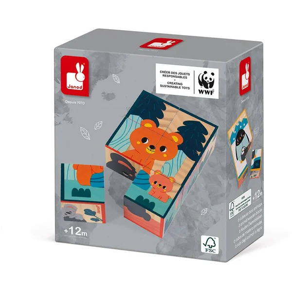 6 cubes en bois massif accompagnés de jolies illustrations d’animaux avec leur petit sont à reproduire : Narval, Ours Brun, Eléphant d’Afrique, Koala, Gorille, Manchot Empereur. Pour plus de facilité, chaque illustration est assortie d’un contour de couleur pour aider l’enfant dans le choix des pièces. Cette activité est idéale pour développer l’observation et la coordination. Bois massif certifié FSC et peinture à l’eau. Janod soutient les efforts du WWF pour protéger l’environnement et la biodiversité grâce à une nouvelle gamme de jouets fabriqués à partir de matériaux plus durables. À travers cette gamme, nous visons à inspirer et à permettre à la jeune génération de se mobiliser pour la faune et la nature.