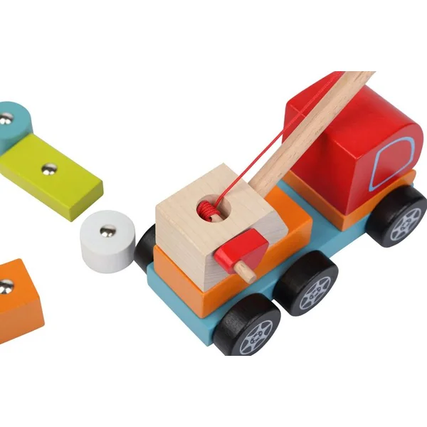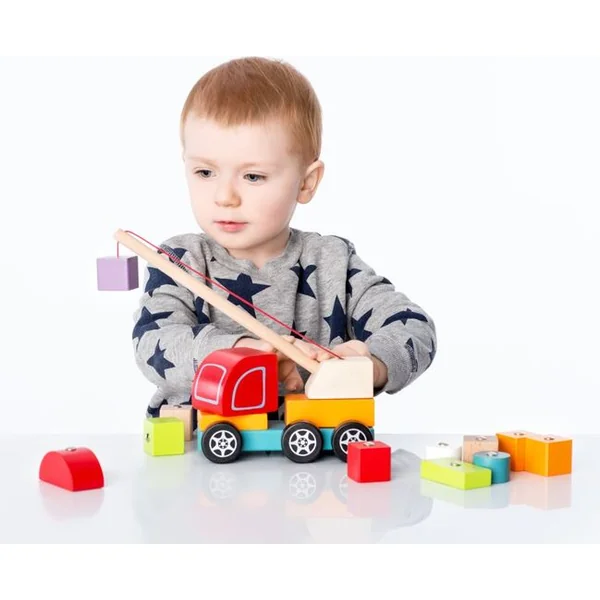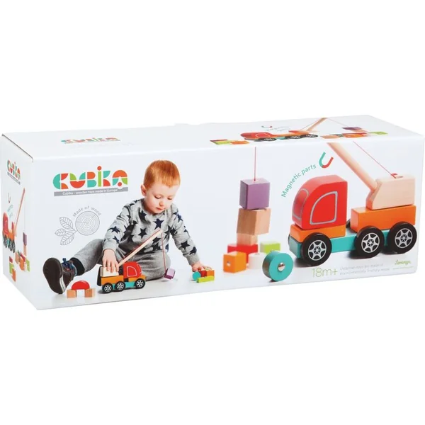 La grue avec un aimant est un puzzle en bois composé de 14 pièces colorées. 10 cubes indépendants représentant la cargaison contiennent des plaques métalliques, grâce auxquelles l’aimant de la grue peut soulever et déplacer.