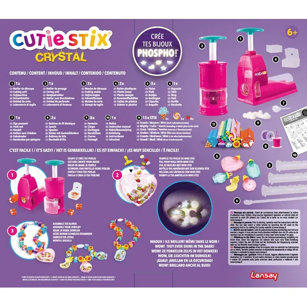De dimensions L32 x P8 x H28 cm, Cutie Stix Mes Bijoux Cristal offre un bon nombre de pièces et petits éléments pour confectionner des colliers et des bracelets stylés. Votre enfant peut y ajouter une touche de brillance grâce aux stix phosphorescents. Une fois remplies, les fioles de mini-stix deviennent de vrais pendentifs.