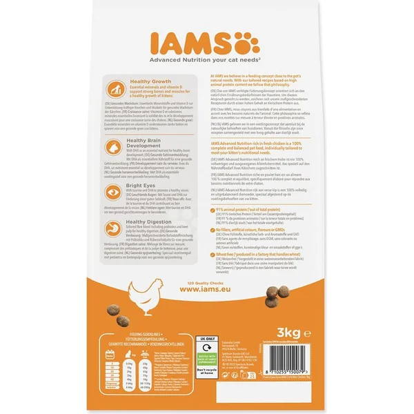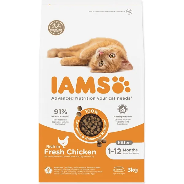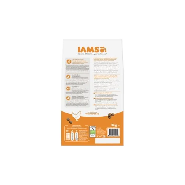 IAMS pour Vitality Kitten Poulet (3 kg) est une nourriture premium, complète et équilibrée, spécialement conçue pour les chatons de sevrage jusqu’à 12 mois. Cette formule fournit aux jeunes chats un apport élevé en énergie et en nutriments de qualité, essentiels à leur croissance dynamique, au développement sain de leurs organes et à leur vitalité globale durant la première année de vie.
