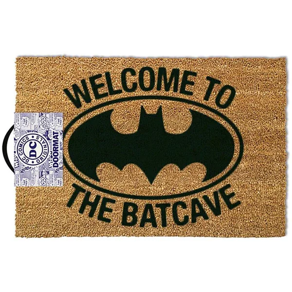 Tapis fibre de coco 60 x 40 cm. Il est noté en anglais Batman Welcome To The Batcave (signifiant en français Bienvenue dans la Batcave). Matières : 50% fibre de coco, 50% PVC.