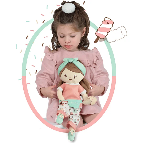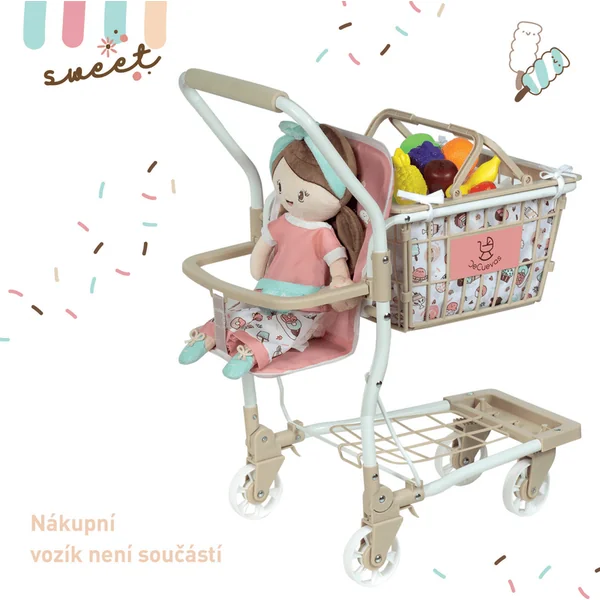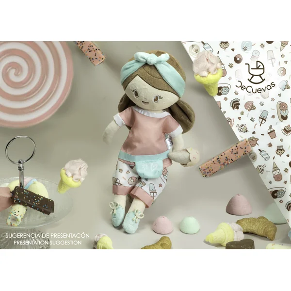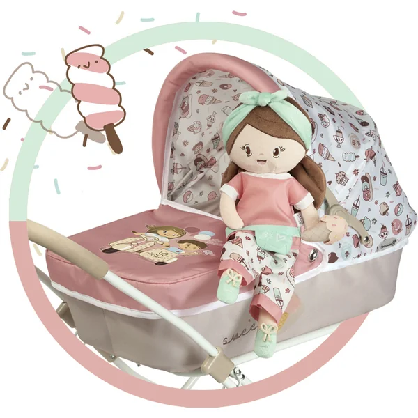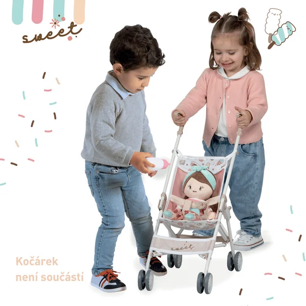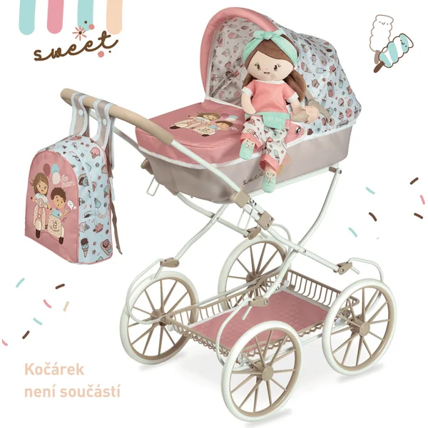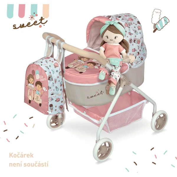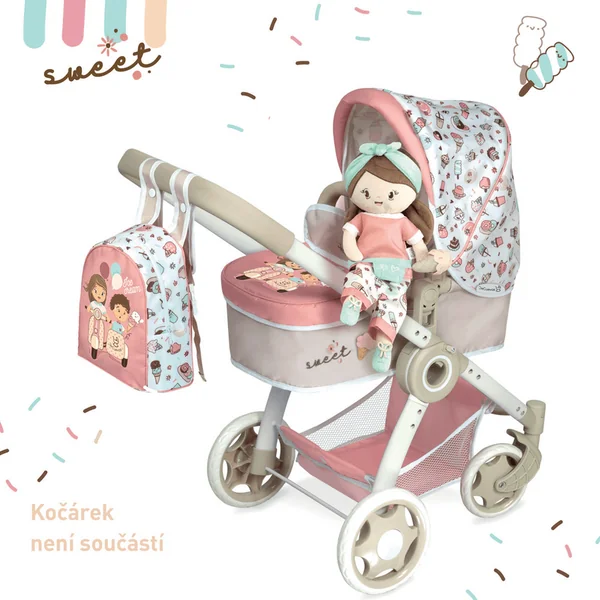 La poupée en peluche SWEET est une petite demoiselle avec une glace à la main, faisant partie de la collection éponyme, qui est une nouveauté de l’année 2022 et propose, en plus de différents types de poussettes, d’autres accessoires pour les futures ménagères. Elle se caractérise par une combinaison de couleurs assorties saumon et beige, ainsi que blanc avec de délicats motifs de petites gâteaux, glaces et muffins, qui donnent une impression mignonne et ludique.