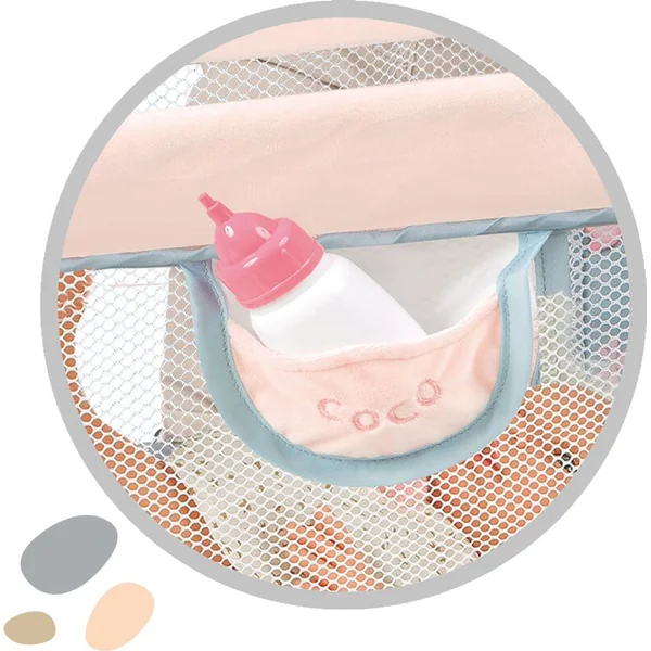 DeCuevas 50080 Lit de voyage pour poupées COCO 2024 fait partie de la collection éponyme, qui est une nouveauté de l’année 2024 et propose non seulement des poussettes, mais aussi d’autres accessoires non seulement pour les petites filles et leurs poupées, mais aussi pour les garçons. Dans la collection ludique COCO, l’image dominante est celle d’une maman dinosaure avec son adorable petit, qui porte encore une coquille d’œuf sur son derrière. L’impression du petit dinosaure sur le tissu gris-bleu délicat est la base de toute la collection, ornée d’éléments de couleur sable ou rose, qui se reflètent également dans la plupart des structures porteuses.