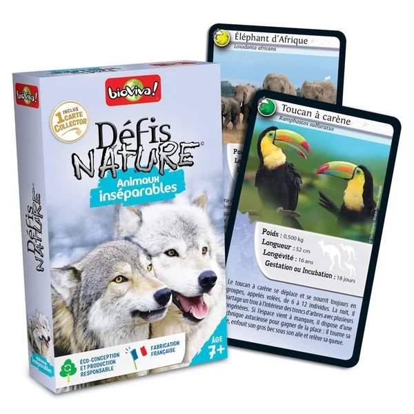 Défis Nature vous emmène à la rencontre des animaux inséparables et des liens incroyables qui les unissent. Découvrez les espèces à préserver, puis pariez sur leurs points forts pour collecter toutes les cartes du jeu et remporter la partie. Contient : 36 cartes, 1 carte collector et 1 règle du jeu. Durée : 20 minutes. De 2 à 6 joueurs. Fabriqué en France.