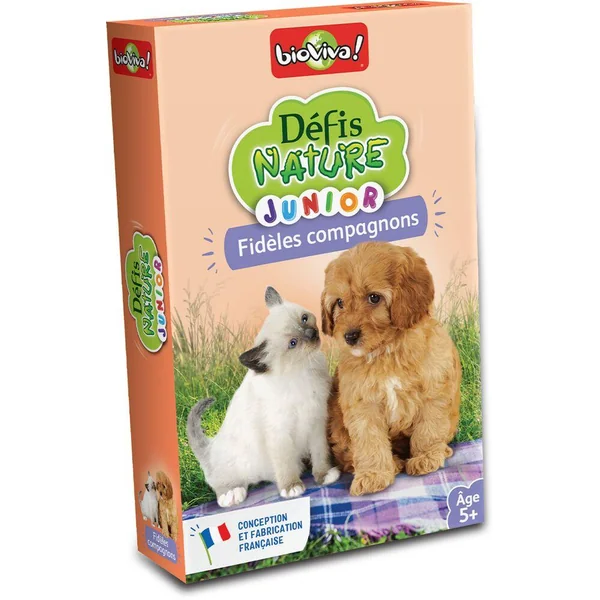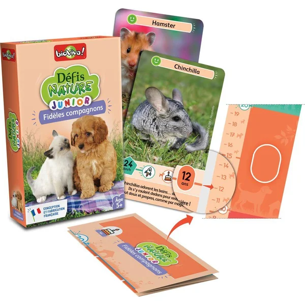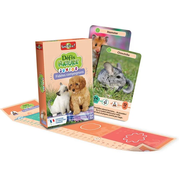 Avec Défis Nature Junior, partez à la rencontre des nombreuses espèces d’animaux de compagnie. Observez vos animaux, comparez leurs caractéristiques en vous aidant de la toise et remportez le maximum de cartes ! De 1 à 4 joueurs. Dès 5 ans. Fabriqué en France de manière éco-responsable.