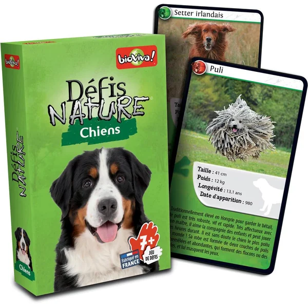 Défis Nature vous emmène à la rencontre des chiens les plus surprenants. Découvrez les espèces les plus amusantes, puis pariez sur les points forts de vos compagnons pour collecter toutes les cartes du jeu et remporter la partie. Alors, prêts à relever le défi ? Contenu : 36 cartes et 1 règle du jeu. De 2 à 6 joueurs. Durée : 20 mn. Fabriqué en France.