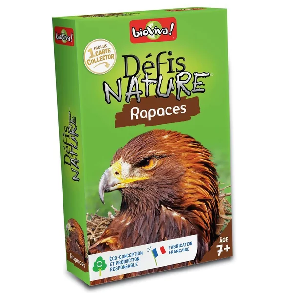 Défis Nature vous emmène à la rencontre des rapaces les plus surprenants de notre planète. Découvrez les espèces à préserver, puis pariez sur les points forts de vos oiseaux pour collecter toutes les cartes du jeu et remporter la partie. Contient : 36 cartes et 1 règle du jeu. Durée : 20 minutes. De 2 à 6 joueurs. Fabriqué en France. Gamme Défis Nature : Des contenus éducatifs uniques, double pion de platine (2,5 Millions de jeux vendus à date), 1 étoile du Jouet 2018 élu par les enfants.