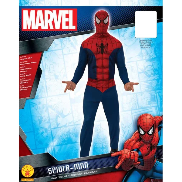 Une combinaison en jersey imprimée bleue et rouge avec logo araignée sur le buste. Une cagoule en jersey assortie avec attache Velcro dans le cou.