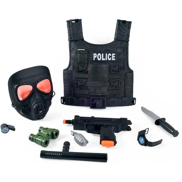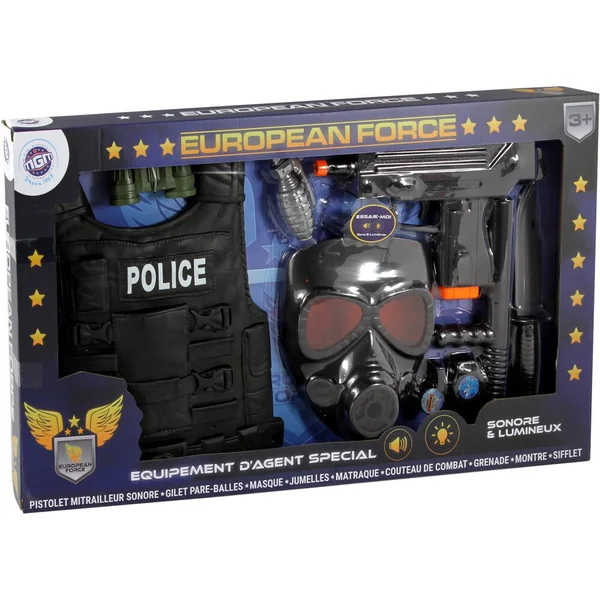 Ce jeu contient 1 mitraillette sonique et lumineuse, 1 gilet pare-balles, 1 masque, 1 sifflet, 1 montre factice, 1 couteau et des jumelles. Ils sont réalisés en plastique. La mitraillette fonctionne avec 3 piles AG10 fournies et remplaçables.