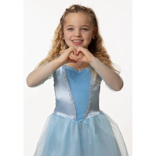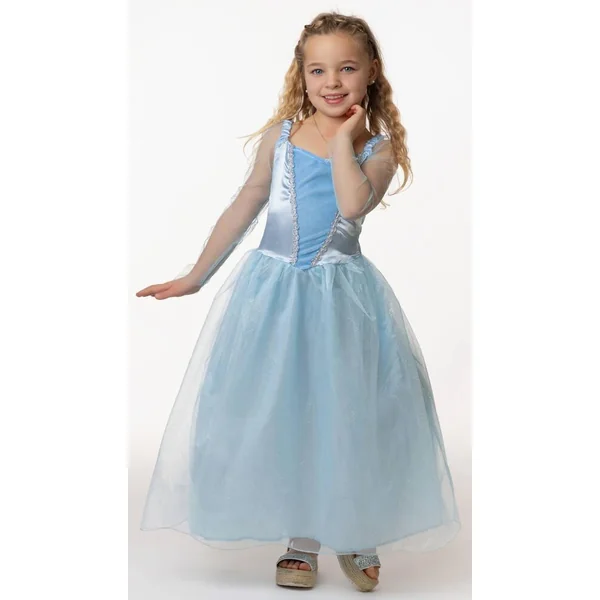 Déguisement de princesse Adèle. Contient 1 robe bleue : col blanc, top avec brocard argenté, dos froncé et manches en tulle, jupe en satin, tulle et organza pailleté. Le modèle est destiné aux enfants de 5-7 ans. Stature : 120 cm. Tour de poitrine : 62 cm. Tour de taille : 55 cm. Matière : 100 % polyester, lavable en machine à 30° en cycle délicat. Chaussures non fournies.