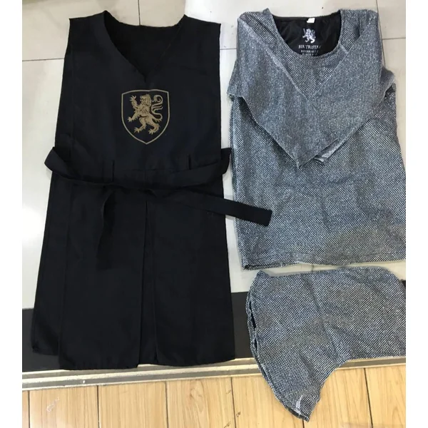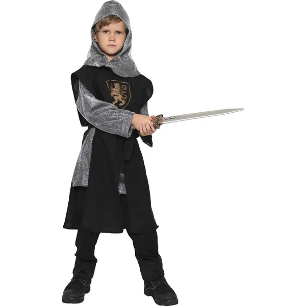 Déguisement de valeureux chevalier. Contient : 1 tunique argentée, 1 gilet noir avec une ceinture noire, 1 cagoule argentée et 1 épée. Le modèle est destiné aux enfants de 5-7 ans. Stature : 120 cm. Tour de poitrine : 62 cm. Tour de taille : 55 cm. Le costume est livré sur cintre dans une housse réutilisable avec fermeture éclair. La housse est en PVC avec le dos en intissé. Matière des tuniques : 100 % polyester, lavable en machine à 30° en cycle délicat. Epée factice, en plastique. Chaussures non fournies. Dimensions de la housse : 45 x 2 x 70 cm.