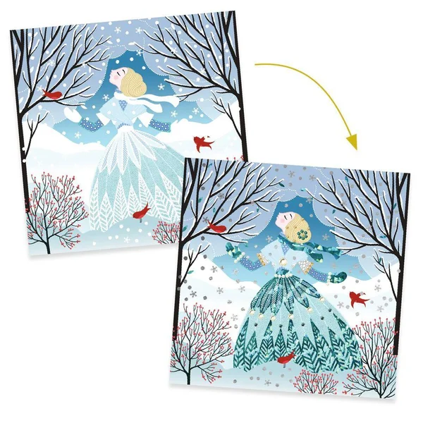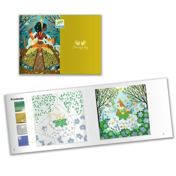 Grâce au code couleur indiqué sur les plahes, l’enfant repère les zones à métalliser. Il dévoile la pellicule protégeant la surface eollée, puis y dépose la feuille métallisée. La matière se dépose comme par magie ! Il colle ensuite les strass et les tableaux s’illuminent.